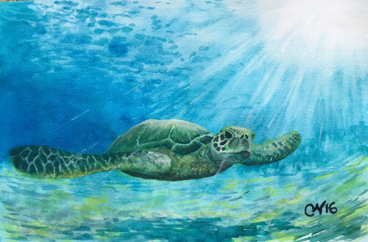 Sea Turtles such as the Hawksbill not only rely on coral reefs, but actually help benefit the corals and other organisms by eating sponges. Original painting: Curtis Whitwam